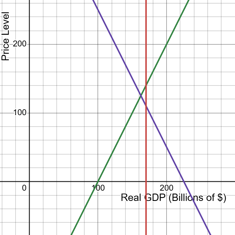 In the graph above, the Long Run Aggregate Supply is presented with a verticle red line, while the Short Run Aggregate Supply is denoted with the green line and Aggregate Demand is denoted with the blue line.