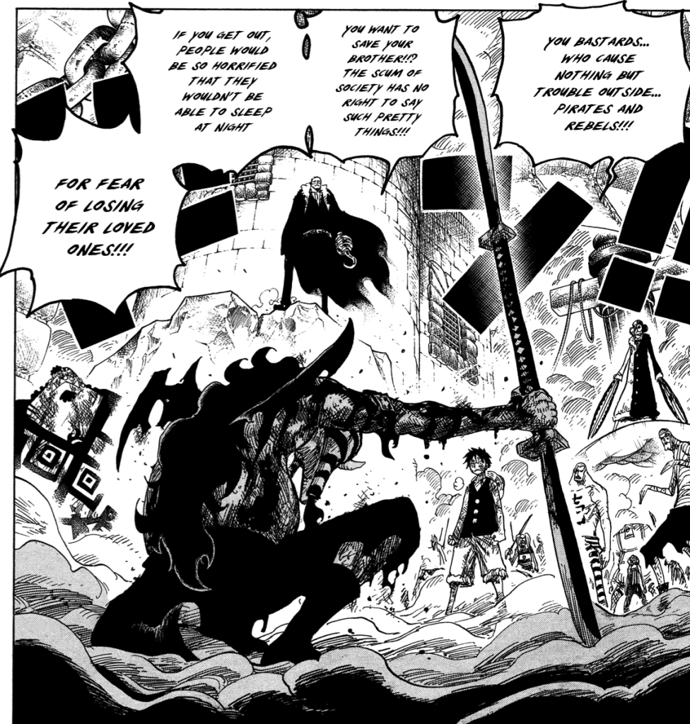 That said, Luffy also acts selfishly at times. When his brother Ace is in prison, Luffy infiltrates the prison to try to free Ace, and as a result of this break-in, he frees numerous prisoners. Some may see this as a positive because he is liberating them, but many of these prisoners are the types of villanous pirates Luffy fights. They hurt people and terrorize towns. Though Luffy is not aligned with them or their morals, he nevertheless has no issue releasing them and allowing them to wreck havoc on the world if it means he can save his brother.